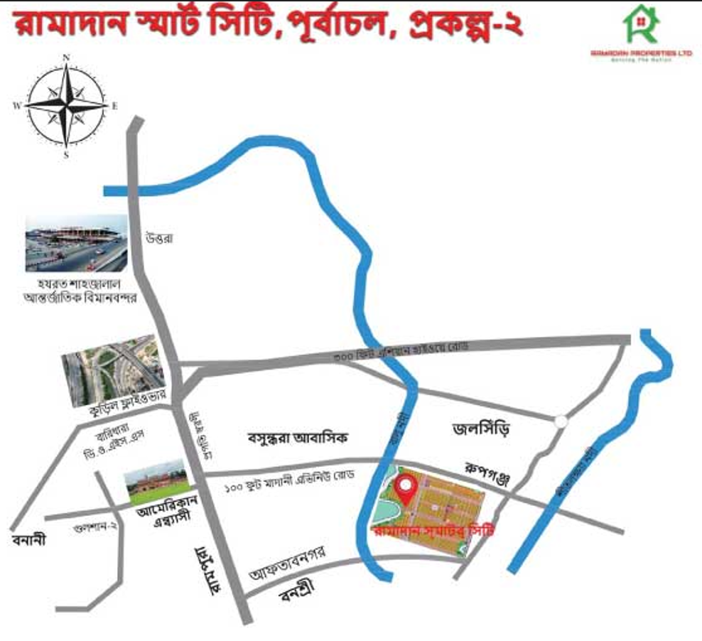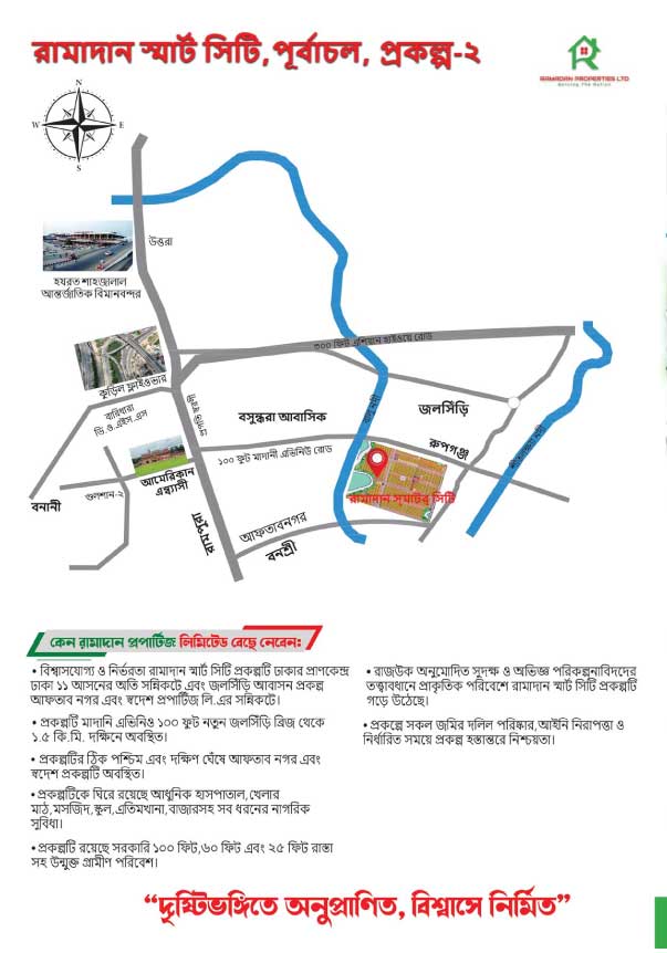 • বিশ্বাসযোগ্য ও নির্ভরতা রামাদান স্মার্ট সিটি প্রকল্পটি ঢাকার প্রাণকেন্দ্র ঢাকা ১১ আসনের অতি সন্নিকটে এবং জলসিঁড়ি আবাসন প্রকল্প আফতাব নগর এবং স্বদেশ প্রপার্টিজ লি.এর সন্নিকটে।প্রকল্পটি মাদানি এভিনিও ১০০ ফুট নতুন জলসিঁড়ি ব্রিজ থেকে ১.৫ কি.মি. দক্ষিনে অবস্থিত।